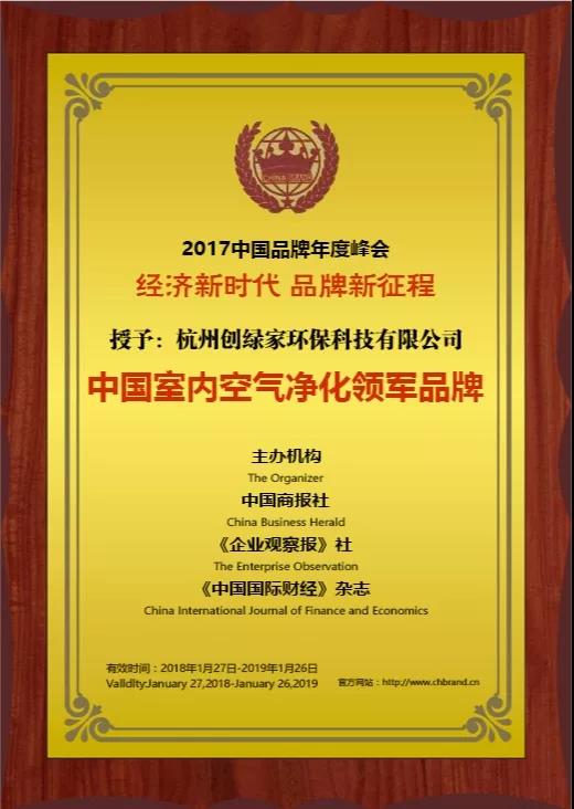 2018年1月26日-28日,由中國(guó)商報(bào)社、《企業(yè)觀察報(bào)》社和《中國(guó)國(guó)際財(cái)經(jīng)》雜志聯(lián)合主辦的“2017中國(guó)品牌年度峰會(huì)”在京隆重舉行。杭州創(chuàng)綠家環(huán)??萍加邢薰緲s獲“中國(guó)室內(nèi)空氣凈化領(lǐng)軍品牌”殊榮。