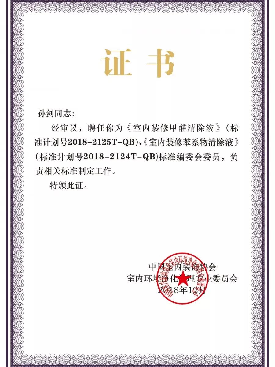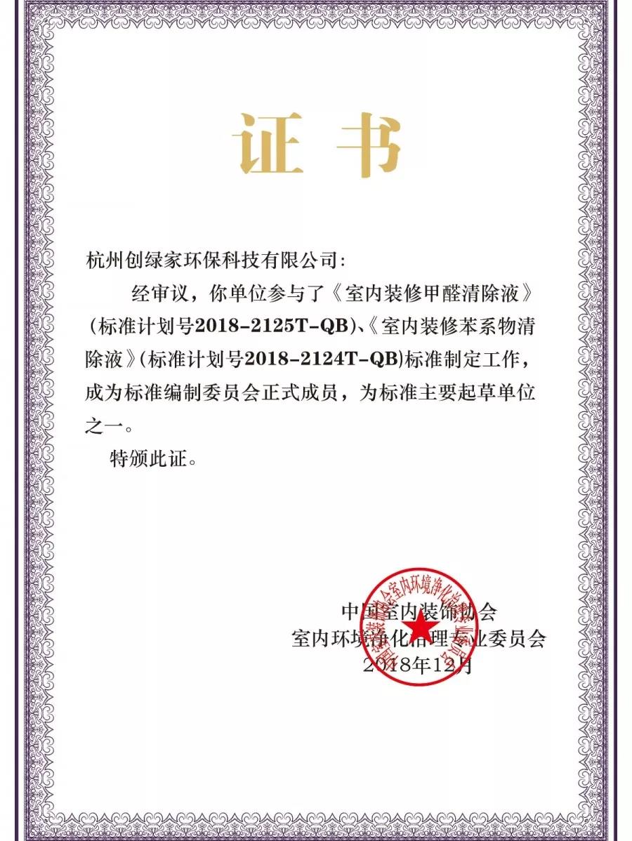 2018年12月19日,中國(guó)室內(nèi)環(huán)境凈化治理行業(yè)第五屆技術(shù)創(chuàng)新分享會(huì)在北京新聞大廈長(zhǎng)安發(fā)布廳舉行。創(chuàng)綠家環(huán)保成為《室內(nèi)裝修甲醛清除液》、《室內(nèi)裝修苯系物清除液》標(biāo)準(zhǔn)內(nèi)編制委員會(huì)正式成員,為標(biāo)準(zhǔn)主要起草單應(yīng)之一,創(chuàng)綠家環(huán)保總裁孫劍被聘任為該標(biāo)準(zhǔn)編委會(huì)委員。